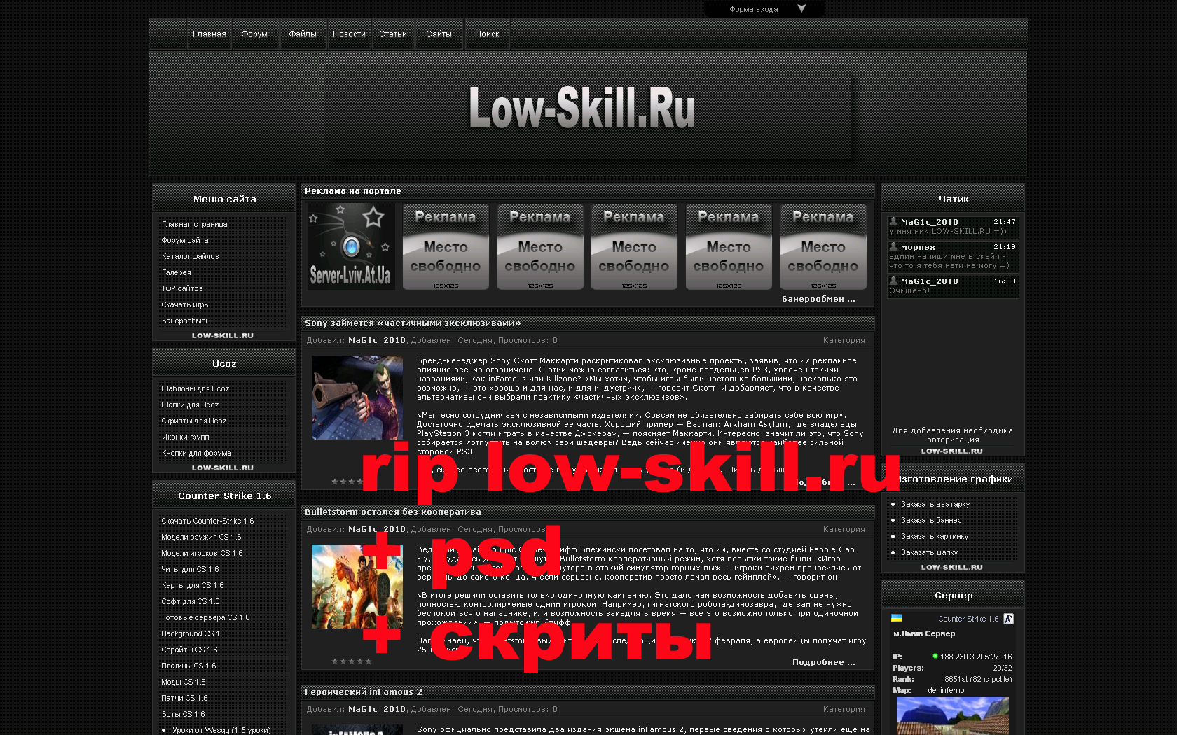 1. Сайт работает в тестовом режиме, вскоре все будет доделано 2. На сайте ведётся баннерообмен с сайтами различных тематик 3. Открыт набор в персонал сайта ( Журналисты, Файловики ... ) 4. В честь открытия сайта на все услуги сайта скидка 15 % 5. На сайте принимаются только баннера новых размеров 6. Конкурс "Новая тема, закрытая , опрос ..." 7. Верстка шаблонов с ПСД исходников в кратчайшие сроки 8. Предлагаем новую услугу для продвижения сайта "Оптимизация" 9. Открыт еще один проект "Мониторинг игровых серверов" 10. Новая услуга от портала : "Раскрутка серверов CS 1.6" 11. Стартовал новый конкурс на "Лучший баннер для Low-Skill.Ru" 12. Просьба : Ваше Предложение по поводу этого сайта 13. Конкурс "Есть новые ответы, нет новых, опрос и тд"